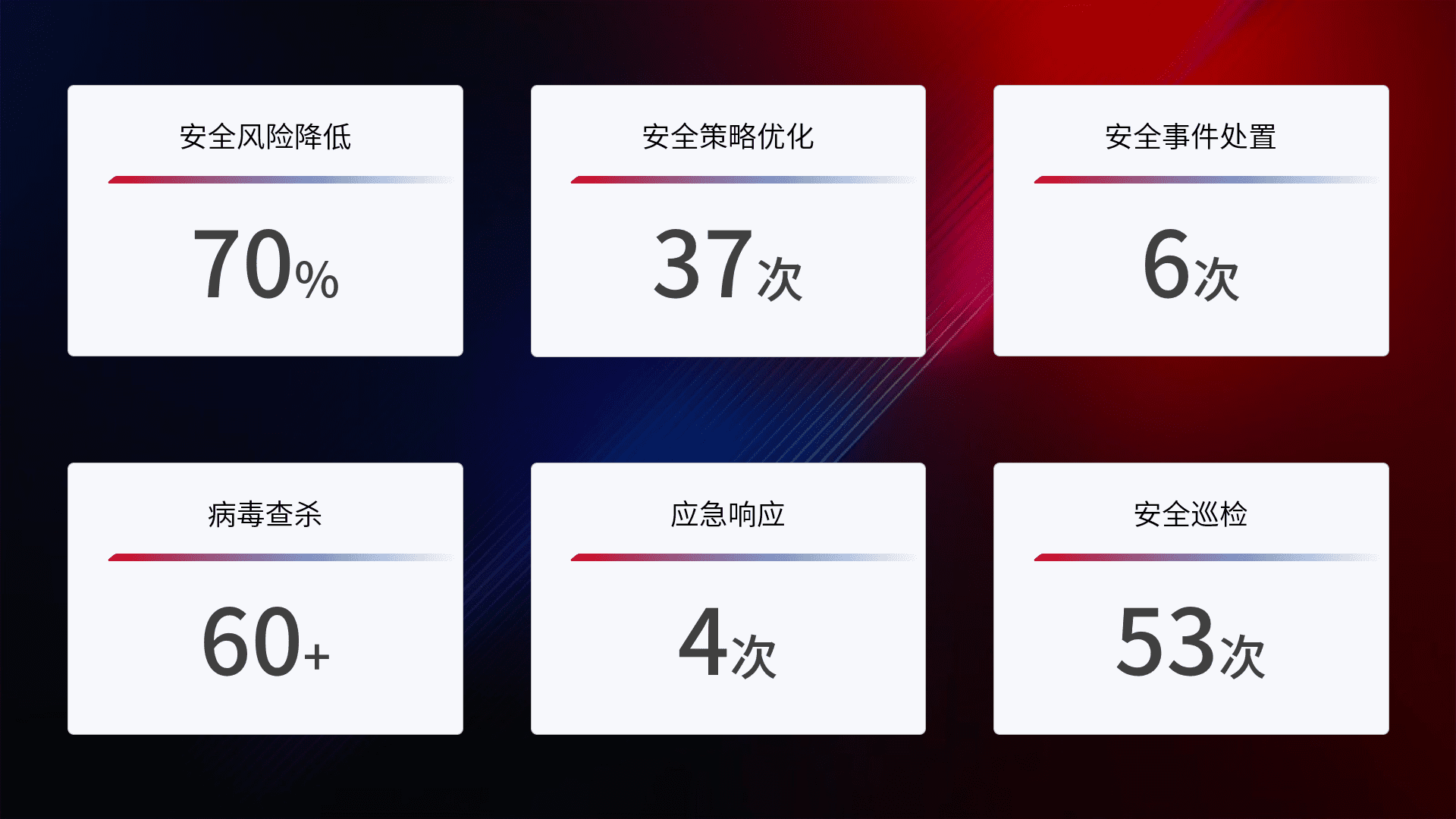 提供全面的安全事件报告体系,,包括处置报告、、、周报、、季度和年度总结,,,,结合持续监控,,,帮助客户深入了解网络安全状况。。