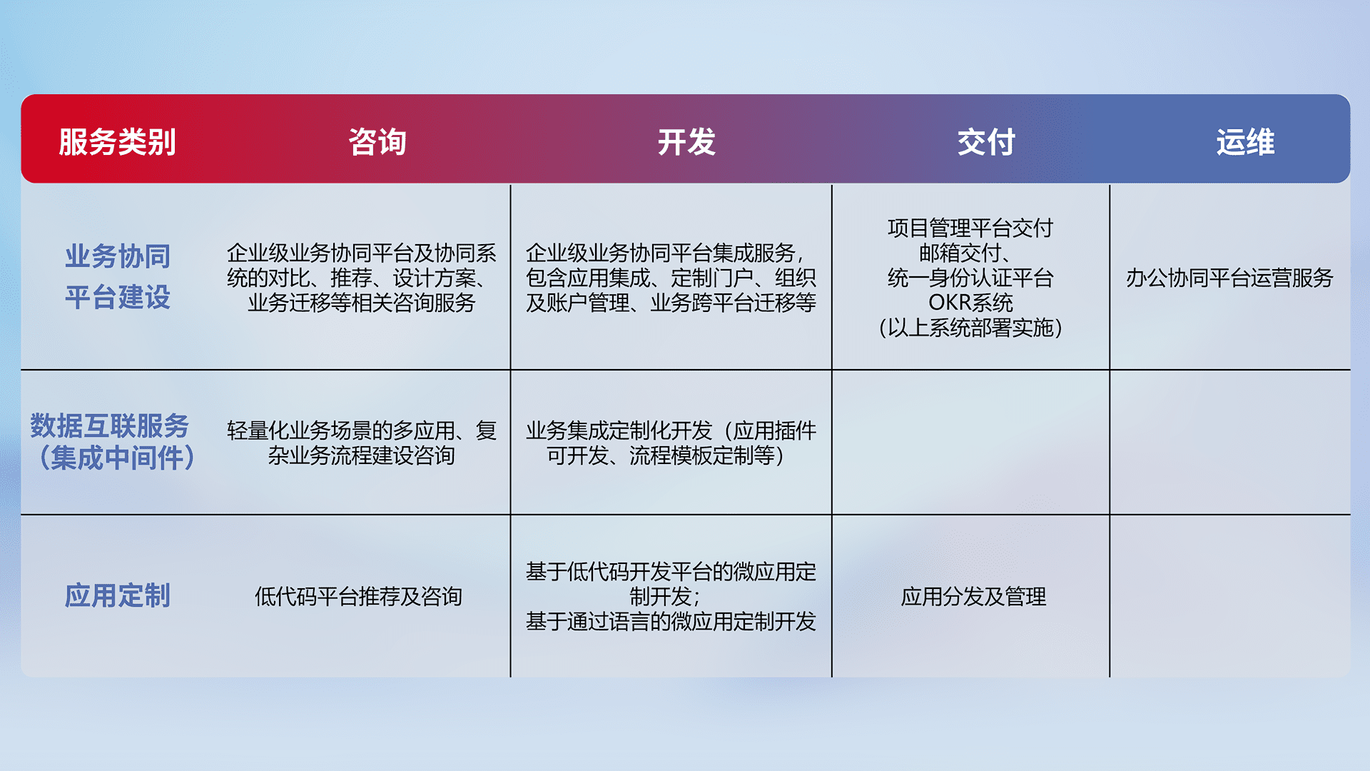 针对钉钉、、、企微、、、IDaas等平台级产品提供产品的规划、、方案、、交付、、、定制化开发等服务,,,,实现如统一协同办公、、智能客户服务、、混合会议管理、、智能数据查询、、等业务场景,,,实现数字化转型。。。。
